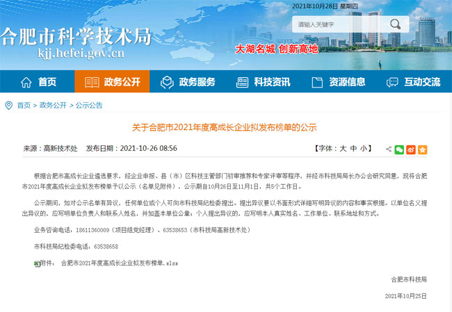 根據(jù)合肥市高成長(zhǎng)企業(yè)遴選要求,經(jīng)企業(yè)申報(bào)、縣(市)區(qū)科技主管部門(mén)初審?fù)扑]和專(zhuān)家評(píng)審,并經(jīng)市科技局局長(zhǎng)辦公會(huì)研究同意,安徽世綠環(huán)??萍加邢薰境晒θ脒x合肥市2021年度高成長(zhǎng)種子企業(yè),公示如下: