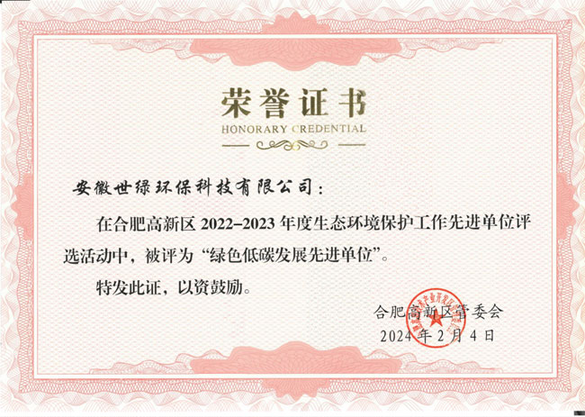 近日,在合肥高新區(qū)2022-2023年度生態(tài)環(huán)境保護(hù)工作先進(jìn)單位評選活動中,我公司被評為“綠色低碳發(fā)展先進(jìn)單位”。