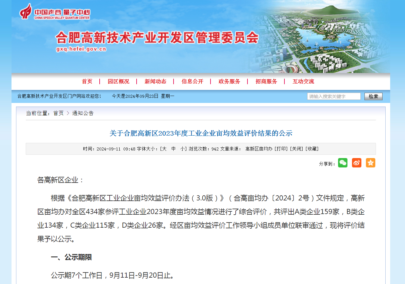 根據(jù)《合肥高新區(qū)工業(yè)企業(yè)畝均效益評價辦法(3.0版)》(合高畝均辦〔2024〕2號)文件規(guī)定,高新區(qū)畝均辦對全區(qū)434家參評工業(yè)企業(yè)2023年度畝均效益情況進(jìn)行了綜合評價,共評出A類企業(yè)159家,B類企業(yè)134家,C類企業(yè)115家,D類企業(yè)26家。經(jīng)區(qū)畝均效益評價工作領(lǐng)導(dǎo)小組成員單位聯(lián)審?fù)ㄟ^,近期對評價結(jié)果予以了公示。