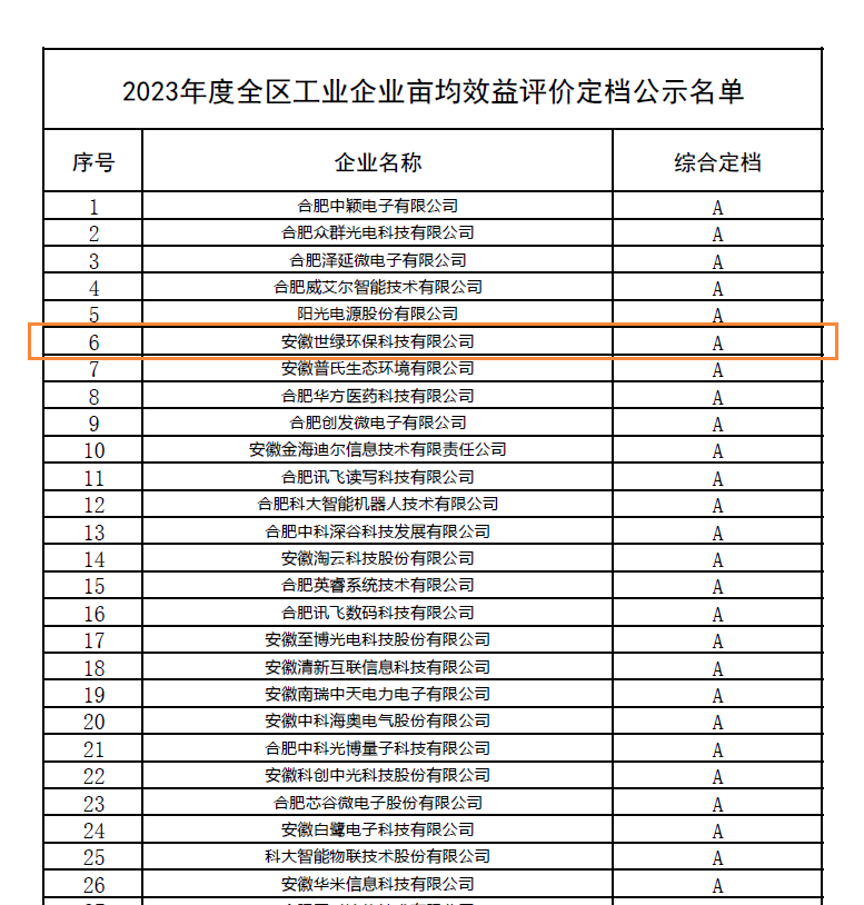 世綠環(huán)保畝均效益評價定檔為A檔